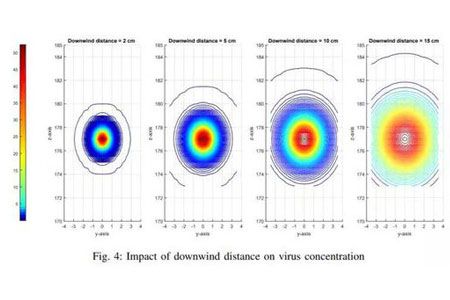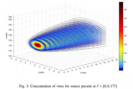 那么,病毒在空气中扩散是什么样子的呢?沙特阿拉伯的阿卜杜拉国王科技大学的研究人员构建了一个模型,模拟含病毒的气溶胶扩散实验,结果如下:可以发现,随着中心位置的拉大,病毒浓度迅速下降。这一点说明,在开放空间可能含有病毒的气溶胶颗粒会迅速扩散,只要保持良好的通风状态和做好防护措施,气溶胶的感染风险极低、/p>