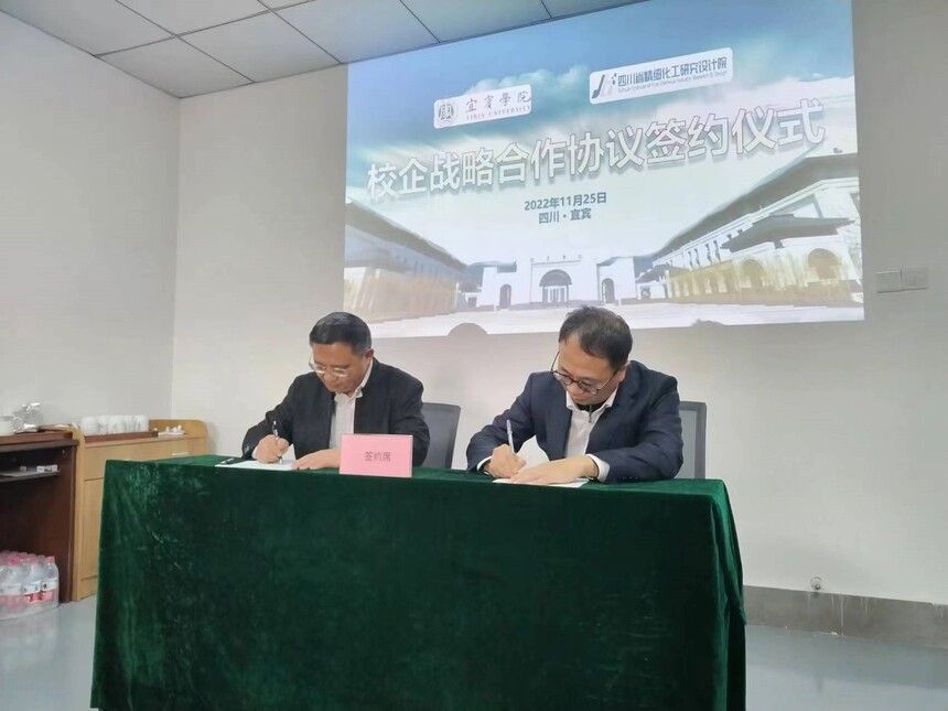 2022年11月25日,四川省精细化工研究设计院(以下简称:省精化院)与宜宾学院校企战略合作协议签约仪式在长江工业园宜宾学院新材料产研院(以下简称:新材料产研院)举行。宜宾学院校地合作办公室主任、科技处副处长杨南翎、新材料产研院党支部书记唐国强、新材料产研院院长陈仕全、团队负责人,省精化院副院长梁宇成、院长助理王荣超,宜宾相关企业负责人参加了签约仪式。