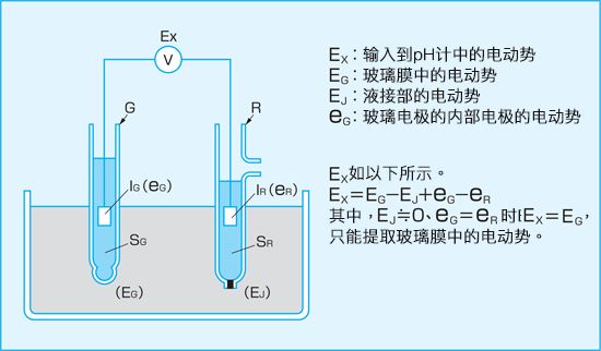 将使用对氢离子有响应的特殊玻璃膜制作的电极浸入被测液体后,玻璃膜表面会产生与氢离子活度对应的电动势。产生的电动势理论上是不能单独提取出来的,需要在基准电极之间连接电压计,并作为与基准电极之间的电位差显示在电压计上。反映氢离子活度的指标称为“pH”,pH和氢离子活性〔H+〕存在pH=-log〔H+〕的关系、/p>