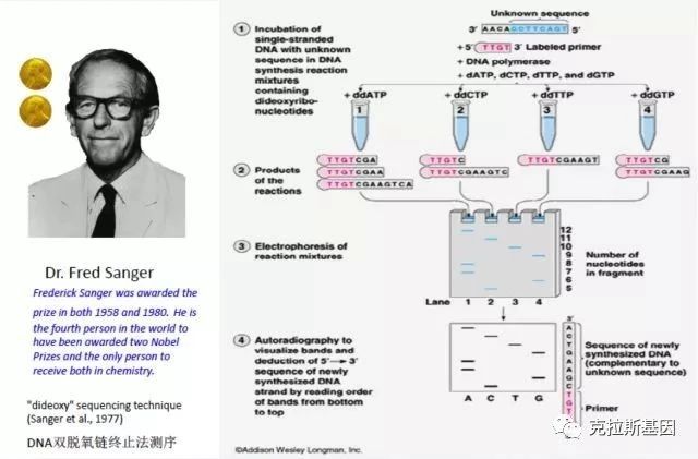 一代测序,又称Sanger测序,是由Sanger教授?975年发明的一种称为链终止法的技术,用来测定DNA序列,这种方法也称做“双脱氧终止法”或是“桑格法”。其核心原理是采用ddNTP取代dNTP,在合成核酸链的过程中ddNTP无法形成磷酸二酯键,从而导致DNA合成反应中断。对每个ddNTP进行荧光标记,产生以A、T、C、G结束的四组不同长度的一系列核苷酸,然后通过毛细管电泳进行分离,通过检测荧光信号获得DNA序列、/p>