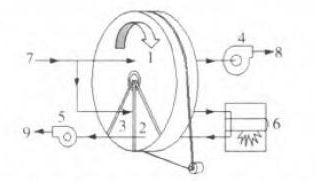 | 1、吸附区 2、再生区 3、冷却区 4、引风机 5、再生风朹br/>6、加热器 7、有机废?nbsp; 8、净化气?nbsp; 9、浓缩废氓br/>? 转轮式吸附工艺结构图 |