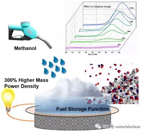近日, 英国Northumbria University 的Terence (Xiaoteng) Liu博士课题组和浙江大学高超教授课题组合作成功将石墨烯气凝胶应用在了直接甲醇燃料电池中。此项工作利用石墨烯气凝胶良好的导电性能,优异的机械性能,高催化剂负载性能和超轻的质量,用石墨烯气凝胶替代传统燃料电池中的两个重要组建---电极板和气体扩散层,大大降低燃料电池重量的同时将燃料电池的质量功率密度提升了3倍。石墨烯气凝胶具有特殊的选择吸附性,即使?2M的甲醇存储在气凝胶中,甲醇也几乎不会穿过质子交换膜。此外,石墨烯气凝胶还起到了燃料存储的作用,使得该燃料电池在无需持续输送甲醇的情况下维持运行,从而省去了外接甲醇存储装置和复杂的燃料循环系统,并降低了制作成本。这项工作对燃料电池的进一步发展起到了重要的推动作用、/p>