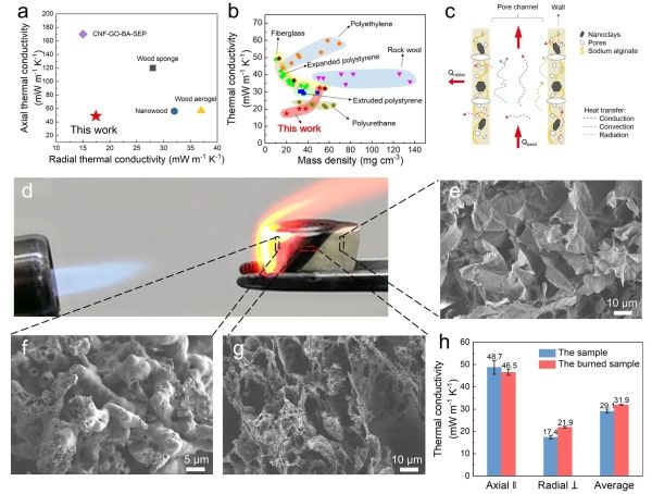 研究人员运用巧妙的表面化学调控方法,实现了在温和条件下活化微米尺度的木屑颗粒表面,从而暴露出纤维素纳米纤??a)。这些颗粒表面的纳米纤维显著增强了颗粒之间的相互作用,结合单向冷冻技术构建了强韧耐用的仿木气凝胶。这种气凝胶有着与天然木材类似的取向通道结构(?b-g),同时,这种仿木结构可以降低气凝胶的热导率,使其具有17.4 mW m-1K-1的超低径向热导率,优于现有纤维素基气凝胶材料和各类商用海??a-c)。此外,加入天然粘土纳米片使得这种气凝胶的耐火性能有了较大改善,可承受1300℃高温的火焰至少20分钟而不被烧??d-h)、/p>