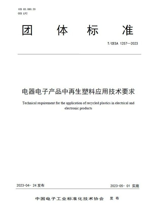 日前,由中国电子技术标准化研究院发起,中国电子工业标准化技术协会发布,?0家电器电子行业知名企业、行业协会和第三方机构共同编制的《T/CESA 1257?023电器电子产品中再生塑料应用技术要求》正式发布。国际独立第三方检测、检验和认证机构德国莱茵TUV大中华区(以下简?quot;TUV莱茵")参与制定、/p>