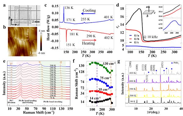 ?. (PMA)2PbBr4的相变表征。a、单晶光学照片;b、表面形貌图像;c、差示扫描量热曲线;d、变温介电谱;e、变温拉曼谱;f、特征拉曼峰位置随温度的变化规律;g、变温粉末X射线衍射谱、/p>