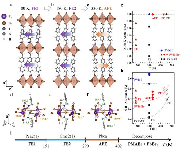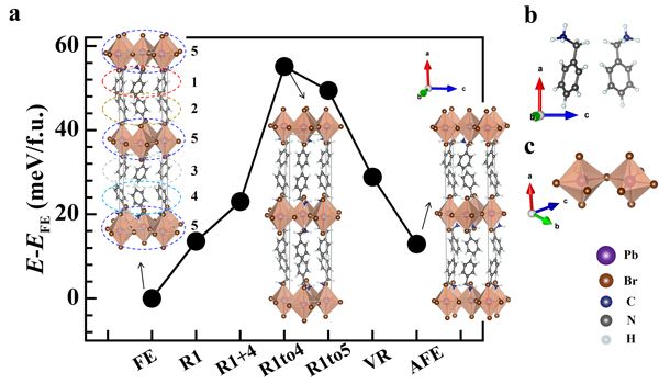 ?.相变的能垒?a)五个相变中间相和反铁电相相对于铁电相I的能量,插图为中间相晶体结构构型?b)苯甲胺分子示意图?c)铅溴八面体构型图、/p>