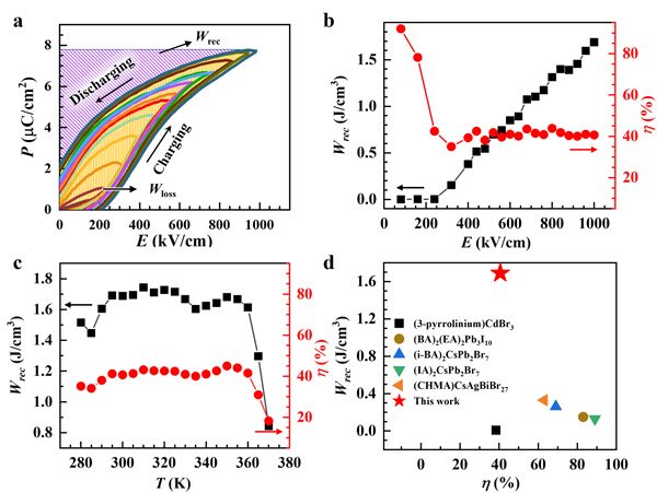 ?.反铁电储能性能?a)通过电滞回线计算储能密度及储能效率的示意图;(b、c)储能密度和能量转化效率随(b)电场?c)温度的变化;(d)已报道的反铁电杂化钙钛矿的储能性能对比图、/p>