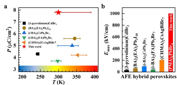 ?.已报道的杂化钙钛矿的反铁电特性?a)最大极化强度和反铁电相的保持温区;(b)杂化钙钛矿所承受的最大电场强度、/p>