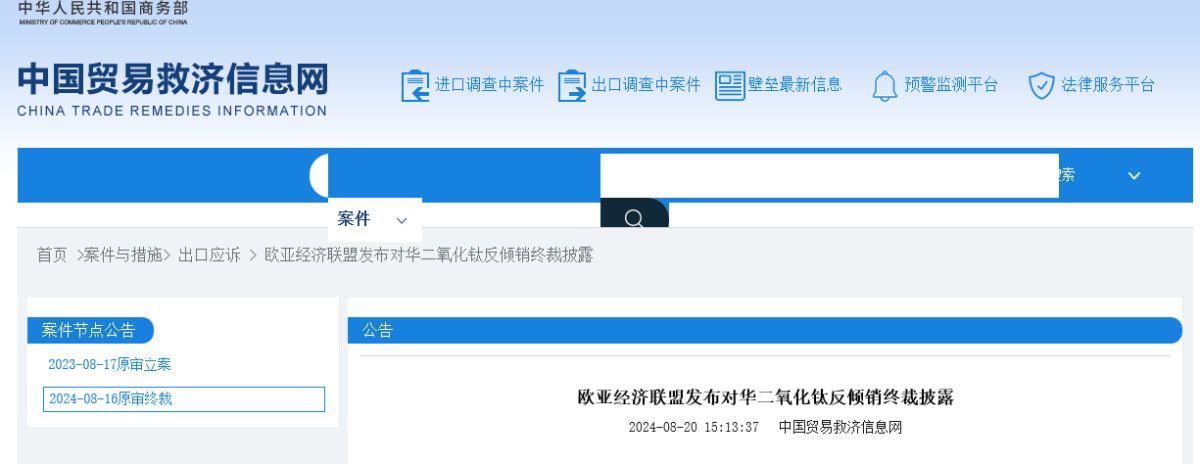 2024??6日,欧亚经济联盟内部市场保护司发布对原产于中国二氧化?俄语:Диокси титана)反倾销终裁披露(参见?024/411/AD38号公?,裁定涉案产品存在倾销,该倾销对欧亚经济联盟相关产业造成了实质性损害,因此,建议对中国生产?出口商征收为期五年的反倾销税,其中,龙佰集团股份有限公?LB Group Co., Ltd.)、河南佰利联新材料有限公?Henan Billions Advanced Material Co., Ltd.)、龙佰禄丰钛业有限公?LB Lufeng Titanium Industry Co., Ltd.)、龙佰四川钛业有限公?LB Sichuan Titanium Industry Co., Ltd.)及龙佰襄阳钛业有限公?LB Xiangyang Titanium Industry Co., Ltd.)税率均为14.27%,山东道恩钛业股份有限公?Shandong Dawn Titanium Industry Co., Ltd.)及中国其他生产商/出口商税率均?6.25%。涉案产品为干量计二氧化钛大于等?0%的颜料,涉及欧亚经济联盟税号3206110000项下的产品,但不包括用于生产香料及化妆品、药品和食品的二氧化钛、/p>
