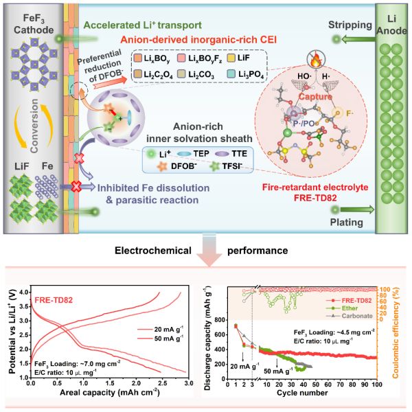 ?氟化铁电池阻燃电解液设计和界面工程的工作亮点