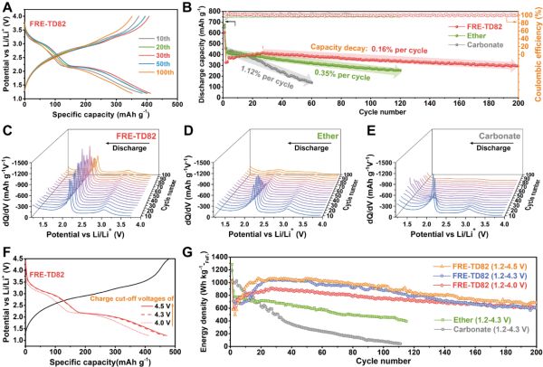 进一步,该研究为转换反应型Li-FeF3电池设计了具有定制溶剂化结构的功能阻燃电解液。这一电解?FRE-TD82)基于磷酸三乙?TEP)?,1,2,2-四氟乙基 -2,2,3,3-四氟丙醚(TTE)二元阻燃溶剂,引入双(三氟甲磺酰基)亚胺锂和二氟草酸硼酸锂分别作为主盐和成膜锂盐添加剂。TEP和TTE溶剂分子的低HOMO能级赋予阻燃电解液超?.5V的高氧化稳定电位。非极性TTE稀释剂改善了电解液对隔膜和电极的浸润性,诱导了富阴离子溶剂化结构的形成。二氟草酸硼酸锂作为成膜锂盐添加剂具有强电子亲和能,能够进一步增强溶剂化结构内鞘层的阴阳离子配位,从而使FRE-TD82电解液的LUMO能级由DFOB-和TFSI-阴离子主导。因此,通过优先的阴离子还原分解反应,在氟化铁正极表面形成了LixBOy/LixBOyFz、LiF和Li2C2O4等无机含锂界面组分。阴离子衍生的CEI膜富含无机组分,呈现薄且均质的形貌,具有电子绝缘性和动态稳定性以抑制界面寄生副反应,可以通过丰富的锂离子跃迁位点以促进界面质量输运。基于FRE-TD82阻燃电解液,转换型Li-FeF3电池表现出持久维持的两阶段锂化平台和稳定的循环性能。受益于稳健的CEI膜和强抗氧化性的电解液,?.5V高充电截止电压下的FeF3正极实现?72mAh/g的高容量?00次稳定循环的优异可逆性。同时,优异的电解液润湿性保证了厚电极内部离子传输路径的渗透性和活性反应位点的均匀性,赋予了FeF3正极在高活性物质载量和贫瘠电解液条件下2.94mAh/cm2的高面容量和良好的循环稳定性、/p>