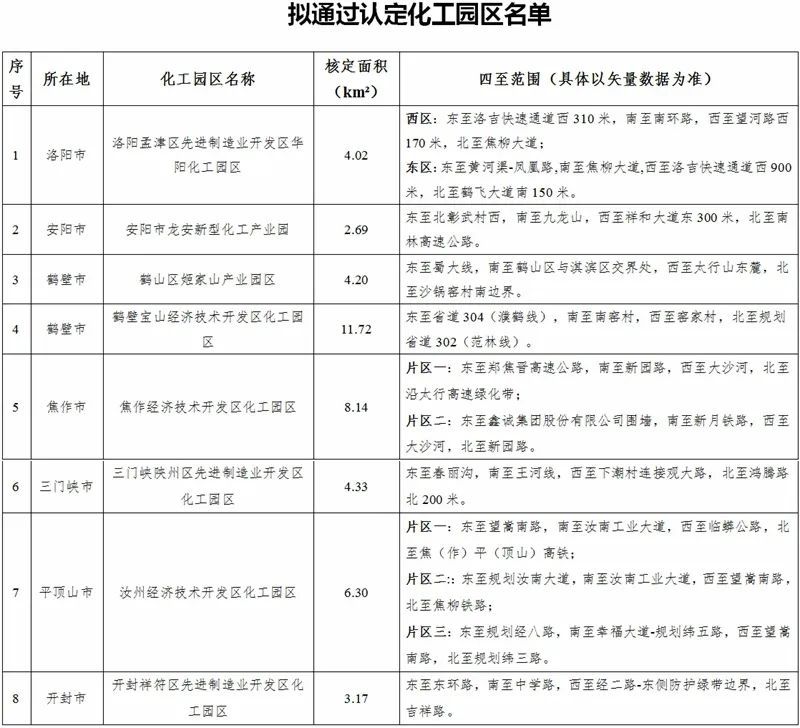 此次公示?家化工园区是:洛阳孟津区先进制造业开发区华阳化工园区、安阳市龙安新型化工产业园、鹤山区姬家山产业园区、鹤壁宝山经济技术开发区化工园区、焦作经济技术开发区化工园区、三门峡陕州区先进制造业开发区化工园区、汝州经济技术开发区化工园区、开封祥符区先进制造业开发区化工园区、/p>