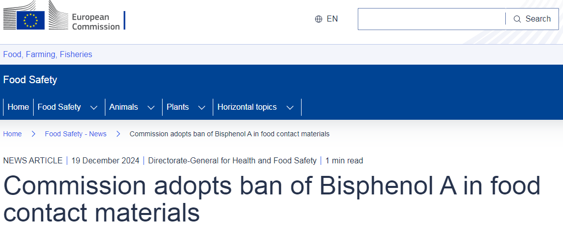 2024?2?9日,欧盟委员会通过了一项禁止在食品接触材料(FCM)中使用双酚A(BPA)的禁令,因为其可能对健康产生有害影响。BPA是一种用于制造某些塑料和树脂的化学物质、/p>