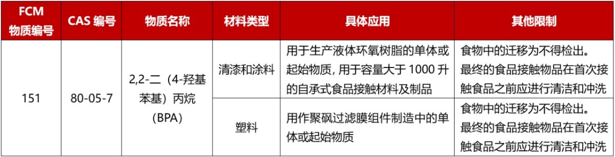 禁止在食品接触用粘合剂、橡胶、离子交换树脂、塑料、印刷油墨、硅胶以及清漆和涂料中使用双酚A及其盐类。除非满足如下情况: