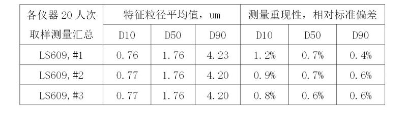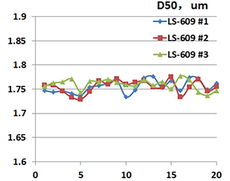 采用完全相同设置的SOP测量,例如自动排气泡、折射率吸收率参数、泵速超声等分散条件等,3台LS-609激光粒度仪各对应的20位操作员的D50测试结果分别以红绿蓝色曲线显示,所有结果均?.76um附近小幅波动?台仪器测试结果D50最大最小值的偏差依次?.4%?.6%?.3%,显示了粒度仪在SOP测试的方式下明显更小的质控风险。同时仪器与仪器之间结果也几乎完全一致,详情请看下表统计结果、/p>
