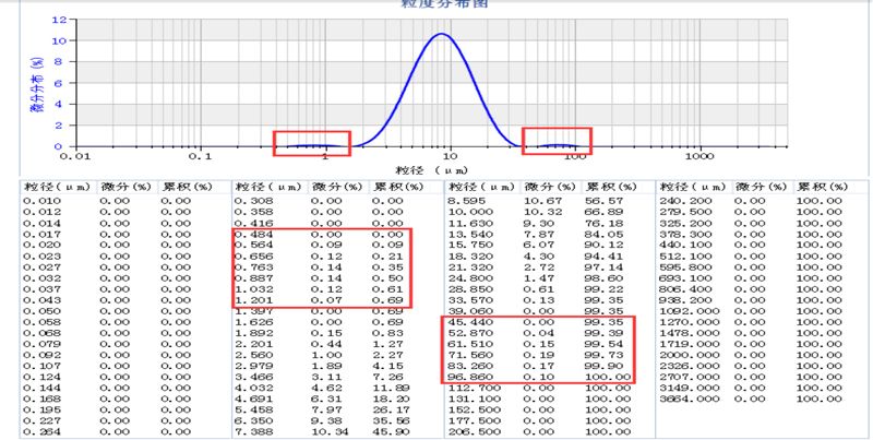 下图所示为欧美克Topsizer Plus激光粒度分析仪测试含有少量大颗粒或小颗粒的石墨原材料的粒度分布图和粒度分布表、/p>
