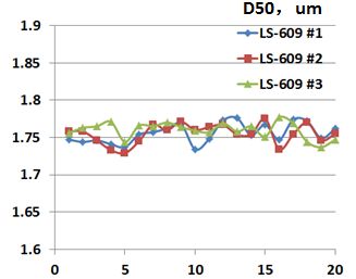采用完全相同设置的SOP测量,例如自动排气泡、折射率吸收率参数、泵速超声等分散条件等,3台LS-609激光粒度仪各对应的20位操作员的D50测试结果分别以红绿蓝色曲线显示,所有结果均?.76um附近小幅波动?台仪器测试结果D50最大最小值的偏差依次?.4%?.6%?.3%,显示了粒度仪在SOP测试的方式下明显更小的质控风险。同时我们也发现,仪器与仪器之间结果也几乎完全一致,详情请看下表统计结果、/p>