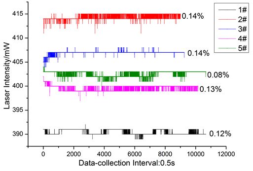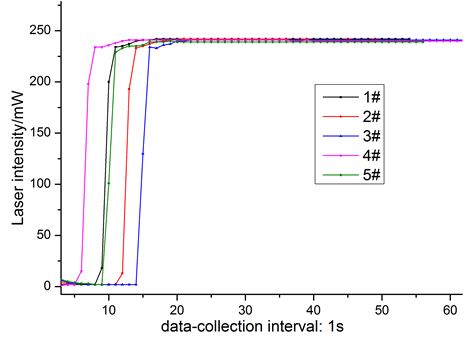 Figure3 the relationship between output laser power and the operationcurrent 1 Reliabilityand Stability Figure 4showing thestability times while open laser. The typical stabilization time is 5 seconds. Thisparameter affects the application directly in rapid detection. Figure 5 showing the long term power stabilitytesting result of 5 samples, it indicated that the laser has a good stabilityin continuous work.