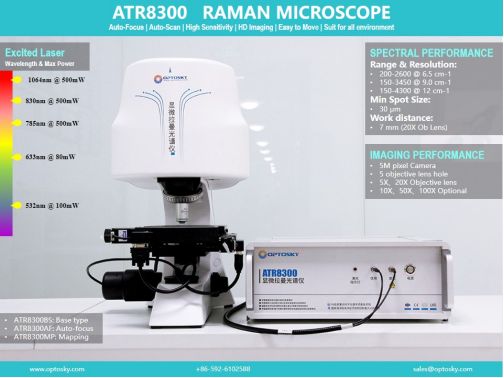 本仪器是一台整合了原子力显微镜(AFM,Atomic Force Microscope)、光学显微镜与激光拉曼光谱仪的先进设备,是三者技术的无缝结合。可以分别利用原子力显微镜和拉曼光谱仪对纳米材料表面形貌、颗粒度、粗糙度和拉曼光谱性能进行表征、分析,从而对样品提供更加全面的信息,同时可以提供锐利的显微图像。这样的集成,能让用户提高工作效率,将更多的时间用于数据采集和分析,而无需为繁琐的仪器操作而苦恼,真正实现样品的原位检测分析。ATRA8300系列将显微镜及拉曼光谱仪两者的优点结合。显微拉曼检测平台使得“所见即所测”成为可能,可视化的精确定位拉曼检测平台,使得观测者可以检测样品上不同表面状态的拉曼信号,并可在计算机上同步显示所检测位置的微区形态,极大便利了拉曼微区检测、/p>