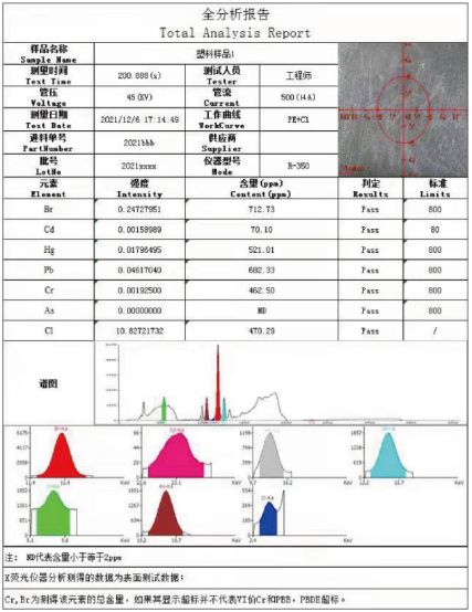 产品特点 l 满足ROHS、ELV筛检要求、/p> l 采用美国Amptek探测器Si-pin,电致冷而非液氮制冷,体积小、数据分析准确且维护成本低、/p> l 采用自主研发的SES信号处理系统,有效提高测量的灵敏度,让测量更精确、/p> l 一键式自动测试,使用更简单,更方便,更人性化、/p> l 七种光路校正准直系统,根据不同样品自动切换、/p> l 多重防辐射泄露设计,辐射防护级别属于同类产品中高级别、/p> l 先进的一体化散热设计,使整机散热性能得到极大提高,保证了核心部件的运行安全、/p> l 独有的机芯温控技术,保证X射线源的安全可靠运行,有效延长其使用寿命,降低使用成本、/p> l 多重仪器配件保护系统,并可通过软件进行全程监控, 让仪器工作更稳定、更安全、/p> l ROHS专用测试软件,标准视窗设计,界面友好,操作方便、/p> 应用领域 l RoHS检测、汽车ELV l 考古分析、珠宝首饰、耐火材料、鞋材皮?/p> l 食品安全、矿石分析、金属合金、石油化工、镀层测厚、环境检浊/p> 1.应用案例 1.1.RoHS测试 ROHS指令管控的产品包括:大小家电、小型家电、信息技术及通讯设备、电动工具、玩具及其他电子电气设备。RoHS为全称为《电气、电子设备中限制某些有害物质指令》,用于规范电子电气产品的材料及工艺标准,使之更加有利于人体健康和环境保护。它不仅包括整机产品,而且包括生产整机所使用的零部件、原材料及包装件,关系到整个生产链、/p>