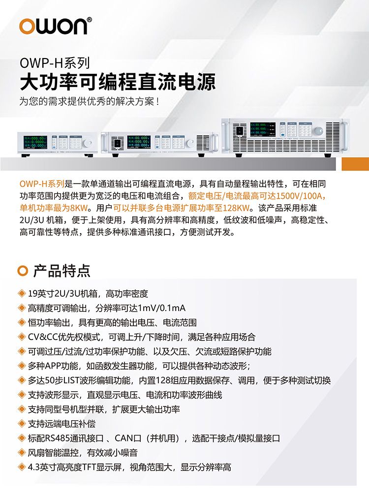 + 标准2U/3U 高度满足嵌入式需汁/span> + 高分辨率高解析度 1mV/ 0.1mA + 恒功率具有更高的输出电压、电流范図/span> + SCOPE显示,直观显示电压、电流和功率波形曲线 + CV&CC优先权,可调上升/下降时间,满足各种应用场吇/span> + list波形编辑输出,可编辑50组定时输出功胼/span> + 函数发生器功能,可以提供各种动态波彡/span> + 支持远端电压补偿 + 支持多台并联,方便扩展电?功率、/span> + 支持128组应用数据保存、调用,便于多种测试切换 + 4.3英寸 TFT液晶显示 + 标配RS485通讯接口,选配干接?模拟量接叢/span> + 智能温控风扇散热,有效降低噪?/span>