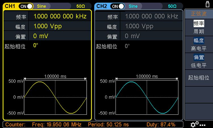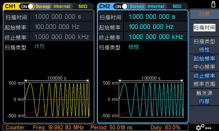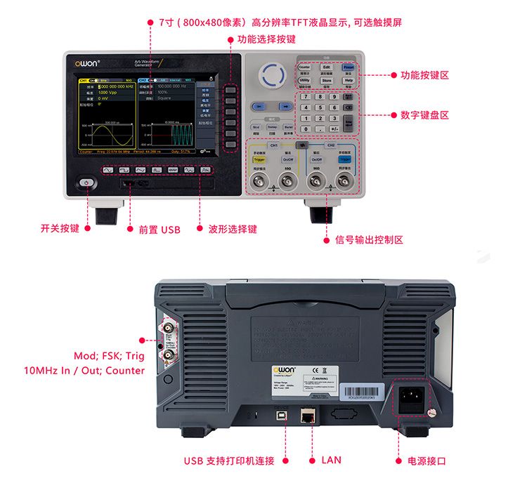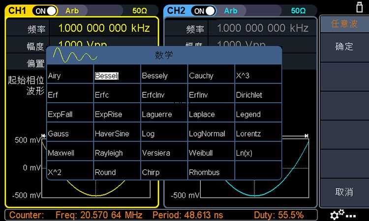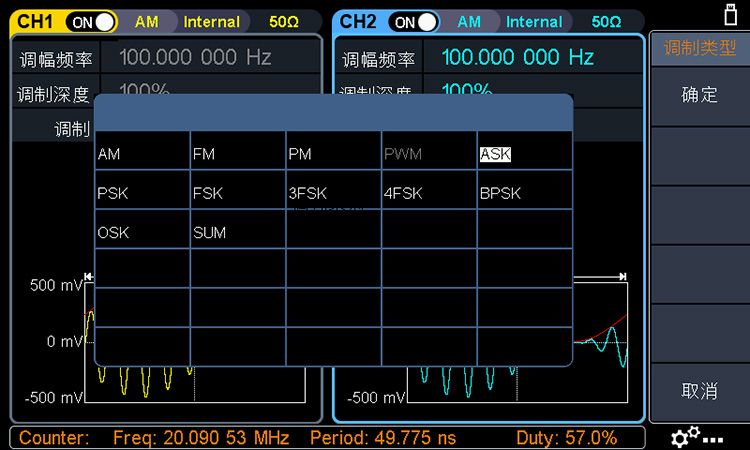 + 采用先进的DDS技术,100MHz最高输出频玆/span> + 500MSa/s最高采样率,频率分辨率1μHz + 14bits ?6 bits(可? 垂直分辨率,10M点任意波形长?/span> + 丰富的波形输出:6种基本波形,内置sinc、指数上升、指数下降、心电图、高斯、半正矢、洛仑兹、双音频、DC电压共计160秌/span> + 丰富的调制功能:AM、DSB-AM、FM、PM、ASK、FSK、PSK、BPSK、QPSK?FSK?FSK、OSK、PWM、SUM + 内置7位高精度频率计,频率范围100mHz 500MHz + 支持SCPI通信功能、labview 通信功能 + 7 ( 800x480像素)TFT液晶?支持触摸操作,多点触控方便快捷,可快速改变波形参数,通过触摸屏还可以编辑绘制任意泡/span> 1.等效双通道