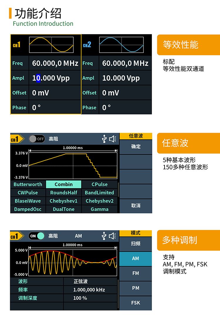 + 丰富的调制功能:AM、FM、PM、FSK、sweep、Burst