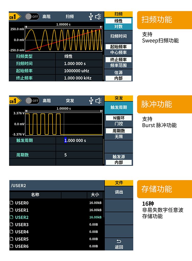 + 丰富的波形输出:5种基本波形,内置sinc、指数上升、指数下降、心电图、高斯、半正矢、DC电压等共?50余种