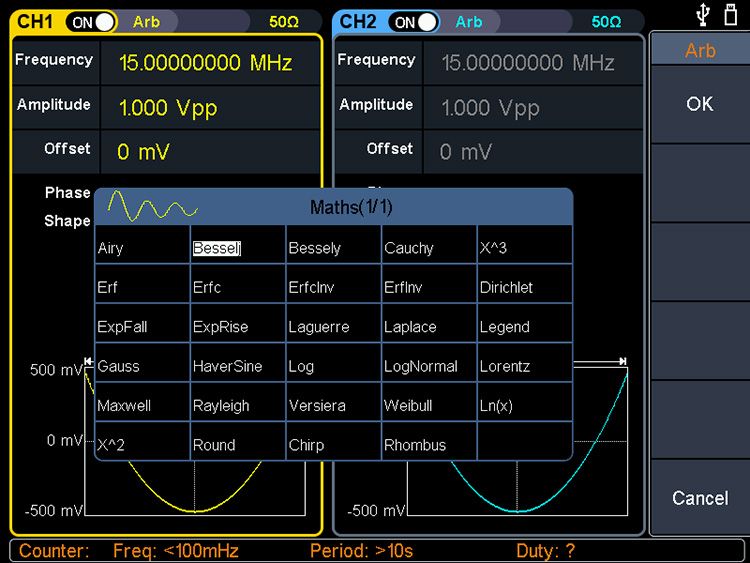 sinc、指数上升、指数下降、心电图、高斯、半正矢、洛仑兹、双音频、DC电压共计150多种 |