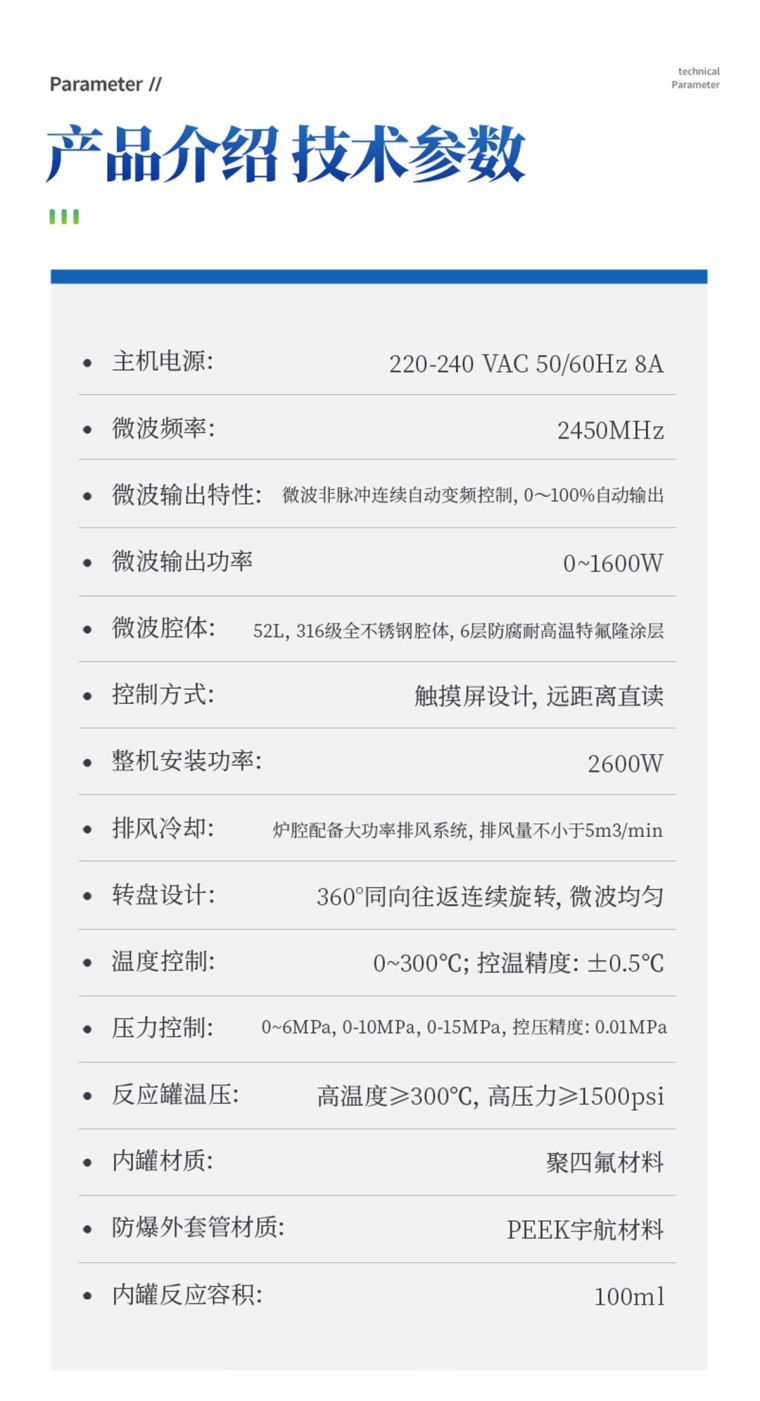 产品说明9/strong> TY-WB20高通量智能微波消解仪为样品提供了快速,安全,自动化的解决方案,在高压条件下加快样品消解反应的速度,广泛应用于食品、环境保护、疾病控制、质量监督、商品检验、科研院所等领域、/p> 产品特点9/strong> 仪器采用微波非脉冲连续自动变频控制,延长了仪器的使用寿命和电磁波的均匀性,腔体采用52L大容积316L不锈钢腔体材料制成,自锁式缓冲防爆炉门,当反应异常时,缓冲结构确保操作人员人身安全和炉门结构完整无损,炉门和腔体结合紧密,微波泄漏符合国家标准。仪器采用温、压双控系统对消解实验的压力和温度进行控制,实时显示?60同向连续旋转,微波均匀,确定各个样品微波环境相同,提高实验结果的一致性。当罐内的压力超过设定的保护值时,微波会自动停止加热。安全防爆膜具有双保险功能,当罐内的压力超过防爆膜所能承受的压力时,防爆膜先行破裂,气体泻出,防止罐体受损和对人体的伤害、/p> 技术参数: 主机参数?.1 源:220-240 VAC 50/60Hz 8A :/p> 微波频率?450MHz:/p> 整机安装功率?600W:/p> ?)电源要求:220 VAC 50 Hz 15A:/p> ?)微波源9/p> ?)微波输出功 ??600W:/p> ?)微波输出特性:微波非脉冲连续自动变频控制,0?00%自动输出:/p> ?)微波均匀性:垂直双向波导设计,三维输出技术,匹配谐波功频实现了高度的场均匀性; ?)微波腔体:52L?16级全不锈钢腔体,6层防腐耐高温特氟隆涂层:/p> ?)自锁式缓冲防爆炉门,在危险出现时能自动提前释放横向压力冲击,确保操作人员人身安全和炉门结构 完整无损:/p> ?)排风和冷却系统:炉腔配备大功率排风系统,各种反应可在通风,安全和易于观察的环境下长时间连续进行。炉腔通风采用耐酸蚀,大风量离心式风机,排风量不小于5m3/min;炉腔内具有风冷功能,持续为反应罐降温,温度和压力实时显示、/p> ?)转盘设计:360同向往返连续旋转,微波均匀,保证各个样品微波环境相同,提高实验结果的一致性、/p> ?0)控制方式:触摸屏设计,8寸TFT-LED?00X480彩)大屏幕显示,远距离直读反应进程,实时显示密闭反应罐温度、压力,并可实时显示温压曲线:/p> ?1)操作语言:中文简佒/p> ?2)自动保护功能:具有故障自检系统;当控温和控压中某一系统失灵时,仪器会自动切断微波发射,并且报警:/p> 控制系统参数9/strong> ?)温度控制系统:采用接触式控温方式,控温准确无误差,使用高精度铂电阻温度传感器;实时检测控制并显示微波消解反应罐内的温度和曲线:/p> ?)温度控制范围:0?00℃;控温精度?#177;0.5℃; ?)控温能力:速率升温功能、/p> ?)压力控制系统:采用非接触式控压方式,控压准确无误差,是沿袭100年技术成熟的控压方式。实时检测控制并显示微波消解反应罐内的压力和曲线:/p> ?)压力控制范围:范围: 0?MPa?-10MPa.0-15MPa,任选、控压精度?.01MPa:/p> ?)压力保护:超压自动调整/停止微波发射并自动报警; 反应罐参数: ?)高温度?00℃,高压力≥1500psi:/p> ?)内罐材质:聚四氟材料; ?)防爆外套管材质:PEEK宇航材料:/p> ?)内罐反应容积:100ml:/p> ?)高压消解罐批处理量?0个样?批(可不更换转子升级?0位):/p> ?)防爆膜片采用陶瓷压紧,陶瓷受热不变形,四氟受热变形,起不到防爆膜作用,采用陶瓷件压紧、/p> ?)消解罐工作方式?60同向连续旋转,微波均匀,各个样品微波环境相同,提高实验结果的一致?/p> |