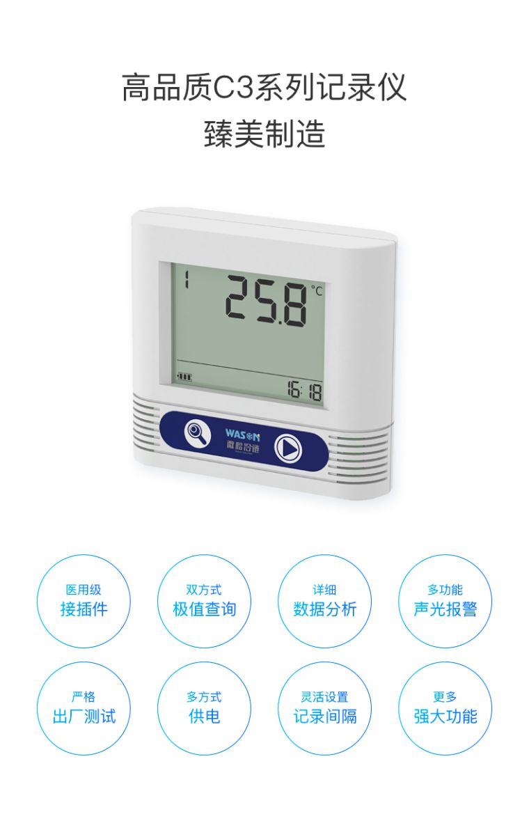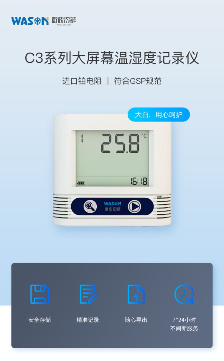 微松C3系列大屏显示温湿度记录仪是一款数据自动存储的单机型精密仪表。该仪表采用低功耗设计,待机时间长;传感器型号多,检测范围广;可外接声光报警器,实现高分贝声光报警。使用C-mi软件可实现参数设置、数据下载、数据分析、数据导出等功能,也可不使用C-mi软件直接从记录仪内拷贝CSV格式数据。广泛应用于食品医药、临床实验、化工电子、档案文博、农业科研等领域、/p>