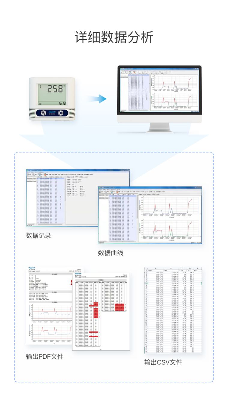 方法二: 当您对数据分析有更多要求时,请使用专用软件下载数据,通过专用软件可以查看数据报表、数据曲线、数据统计、记录备注等信息,还可输出PDF数据文件、/p> ①拷贝专用软件到您的电脑,绿色软件,无需安装,打开即可使用、/p> ②停止记录状态下连接记录仪到电脑,进行参数设置、/p> ③记录仪脱离电脑,放置到需要检测的环境,开启记录、/p> ④停止记录,连接记录仪到电脑,通过软件查看历史数据、历史曲线、数据统计等,进行数据打印、输出PDF等格式文件操作、/p> |