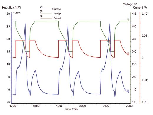 等温吸放热实骋/h4>- 样品类型:纽扣电 LiR2032 数据显示,充电时的特点是一个短暂的吸热随后出现微弱的放热反应,而放电的特点是时间较长的放热反应。循环具有可靠的重复性、/p>