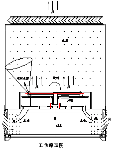 水喷射驱动风机雾化式冷却塔是利用热水与冷、干空气的热传导和循环冷却水的蒸发带走气化潜热而达到降低水温的目的。本产品充分利用了原循环水系统中存在的压力,以此为动力源,压力水经进水管进入安装在塔底部的“水喷射驱动风机旋转雾化装置”,该装置由旋流雾化喷头、风机、转动机构组成,利用水力驱动原理,热水通过旋流雾化喷头在塔内形成雾流,喷雾流的反作用力推动喷头和风机旋转,风机旋转将周围的空气吸入塔内,旋转产生的离心力使水流增压,离心增压的结果提高了喷头的转速和流量,增大的转速又促使雾流的流速进一步提高并具有夹带、卷吸作用,使雾化喷头周围产生一定负压,进一步加大了冷却塔从周围环境的抽风量,同时带动底部空气向上流动,致使冷空气与水雾混合更充分。气、水充分混合后的雾气流向上至一定高度后,水的动能转化成势能,在重力作用下向塔底回落,空气和带出的热量经由安装在塔顶的收水装置排出塔外,回落的水在经淋水板上聚集,并经淋水板将水分布成水帘状态流入水池或安装在塔底的集水箱,经出水口流入水池、br/> 由于设计中充分利用了旋转喷头的离心增压作用,所以,“水喷射驱动风机旋转雾化装置”仅?.1Mpa的水压下即能形成雾流,并能产?.6~1.2的气水比。此外,高温热水在进入冷却塔雾化的同时,装置吸入引射冷风,使冷却塔系统内部的热交换时间提前。而且,经雾化后的水滴直径呈几何级数减少,散热面积极度增大,使冷却塔内的高温热水与冷风直接在雾状条件下进行传热和传质,吸入的引射冷风带走高温冷却水中的热量,最终实现了循环冷却水的冷却要求、br/> 由以上工作过程可见,水在冷却塔内有上升、悬浮、下降三个过程。同时冷却也有顺流冷却与逆流冷却两个过程,因此与冷、干空气接触时间更长、更充分,带走的热量更多。加上淋水板将进风区与塔体进行了隔离,避免了回风以及多个喷雾装置的相互干扰,并同时使喷雾流产生二次引射风。机械抽风与引射风相互叠加,使气水比增大,再加上塔内风阻小,以及风道和淋水装置的合理配置,因此水喷射驱动风机雾化式冷却塔具有良好的降温效果、br/>三、型号及意义说明