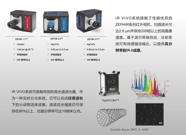 IR VIVO 近红外小动物活体成像系统——提供一种全新的小动物观察研究视角。利用二区近红外光incomparable的成像优势,IR VIVO系统可对小动物进行活体扫描,独特的高速摄像机及HyperCubeTM高光谱滤光器使IR VIVO可以详细研究任意波长下的红外成像情况、br/>