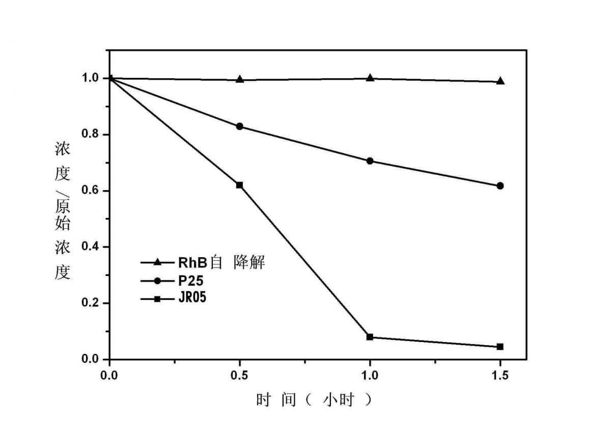 下图为模拟太阳光照射下,所制备的二氧化钛及市售Degussa P25对罗丹明B的降解曲纾/span>,从图中可以看出,所制备的二氧化?图中用TiO2标注)具有很好的光催化活性,在模拟太阳光照射下,大约1小时内可实现对污染物的完全降解。而在同等条件下,市售Degussa P25仅只能降?0%左右、/span>