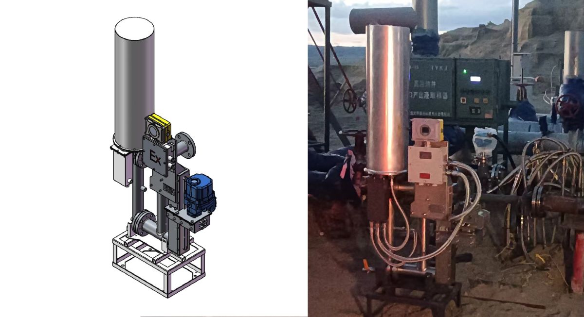 一、设备概述 高温井口原油含水分析仪(型号:ALC05-HT)是在普通型井口原油含水分析仪基础上,增加了防止高温来液对传感器造成损坏的探棒伸缩保护机构,主要应用于单井来液、油田计量间、多路阀组后的高温原油含水率测量,可以安装在计量间电动多通阀或手动阀组计量出口工艺流程上面,完成对多路单井来液的含水率测量。与工艺管道通过两个DN50(其它规格定制)法兰直接连接,实现了在线实时取样、非实时测量的功能。本井口含水分析仪的结构及测量方式消除了原油中含气或者其他杂质对含水测量结果造成的影响,提高了测量精度。此外,当高温来液进入测量管道时,首先对其进行散热降温至目标温度后,再将上方探棒插入至测量管道中进行测量,测量完成后先将探棒拔出至测量管道外侧,在打开阀门以起到保护探棒的作用。 二、参数指标