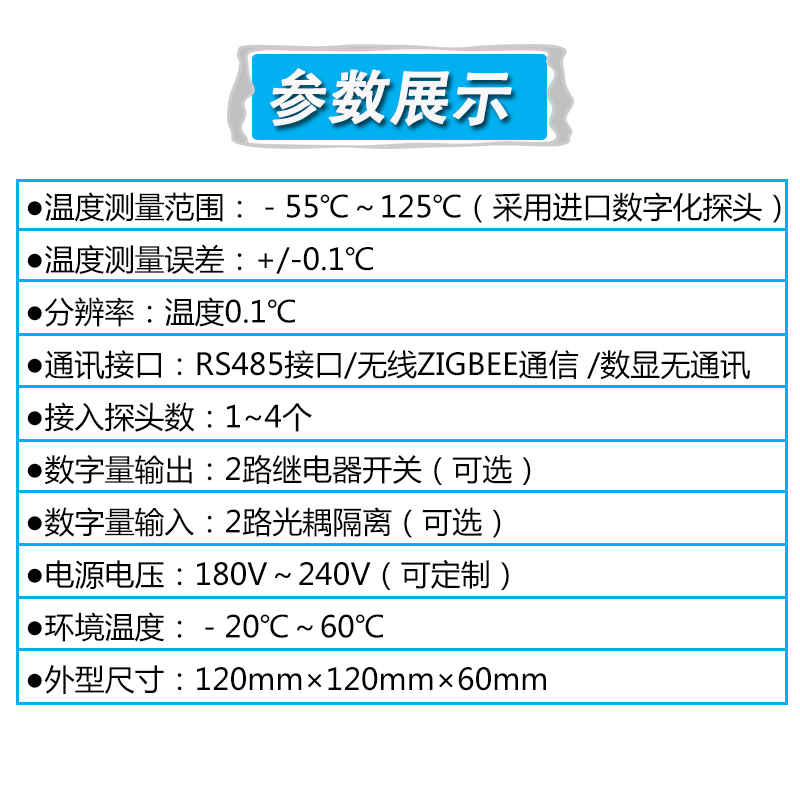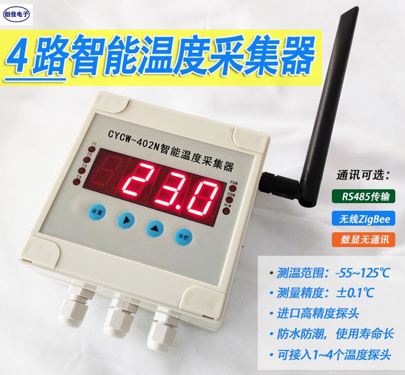 下位机主要采?/span>CYCW–/span>402旟/span>线温度表。该表外壳采?/span>ABS工程塑料防水外壳,具有较好的防水防潮性能。可接入1-4个数字化RW1820温度探头。通信方式丹/span>无线ZIGBEE通信、/span> 主要参数9/span> ●温度测量范围:,/span>55℃~125℃(采用进口数字化探头) ●分辨率:温?/span>0.1℃ ●显示方式:4佌/span>0.8寸数码管 ●通讯接口9/span>无线ZIGBEE通信 ●接入探头数9/span>1-4?/span> ●电源电压:180V}/span>240V ●环境温度:,/span>20℃~60℃ ●外型尺寸:120mm×120mm×60mm ●测量精度:A级:±0.1ℂ/span>(-20℃~+50ℂ/span>)