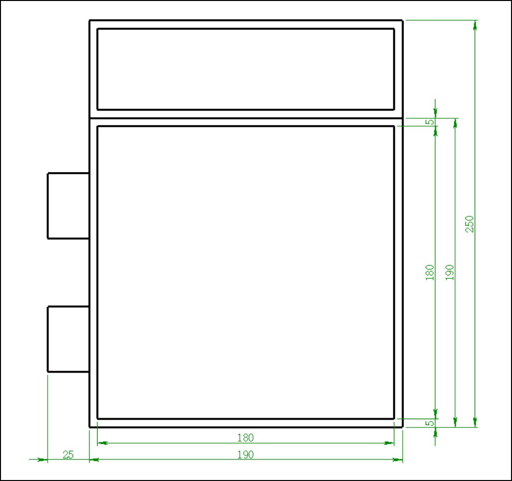 六.技术参?/span> *腔体采用铝合金制作,耐腐蚀,结构牢固; *真空?/span>≣/span>-96Kpa(买方自备真空?:/span> *封头温度:常温~250℃,温度可调:/span> *温控精度:?.5℃; *热封时间??9秒可调; *封边宽度?±0.4mm(根据客户要求):/span> *最大封边尺寸:200mm:/span> *封印厚度范围?0~300um *耗气量:?.2L压缩气体/每封一次、/span> *空压工作速度:≥180?h *功率:采?00w发热管,加温时的功耗约0.6KW、/span> *控制系统:PLC *电源?20V/50Hz:/span> *压缩空气源:0.5?.7Mpa:/span> *外形尺寸:L520*W400*H600 *重量?8KG *最大放电池尺寸:如下图 七.主要电气及标准件品牌