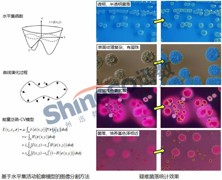 能量泛函的过程中活动轮廓不断逼近分割目标,直到活动轮廓线停止进化?能量泛函最?分割完成。其基本原理是把曲线或曲面嵌入高一维水平集函数中,用一个高维函数来表达低维曲线或曲面的演化过程。Supcre G9汇聚?8种图像处理算法,实现了对各类疑难菌落图像的准确分割和统计、br/>