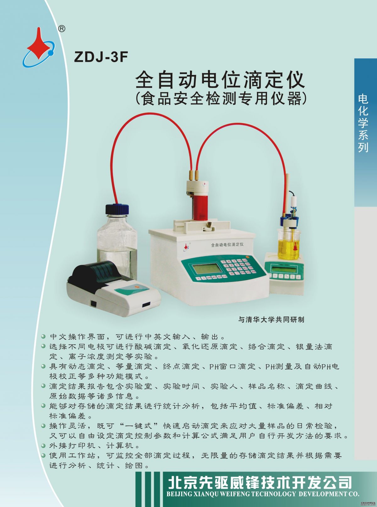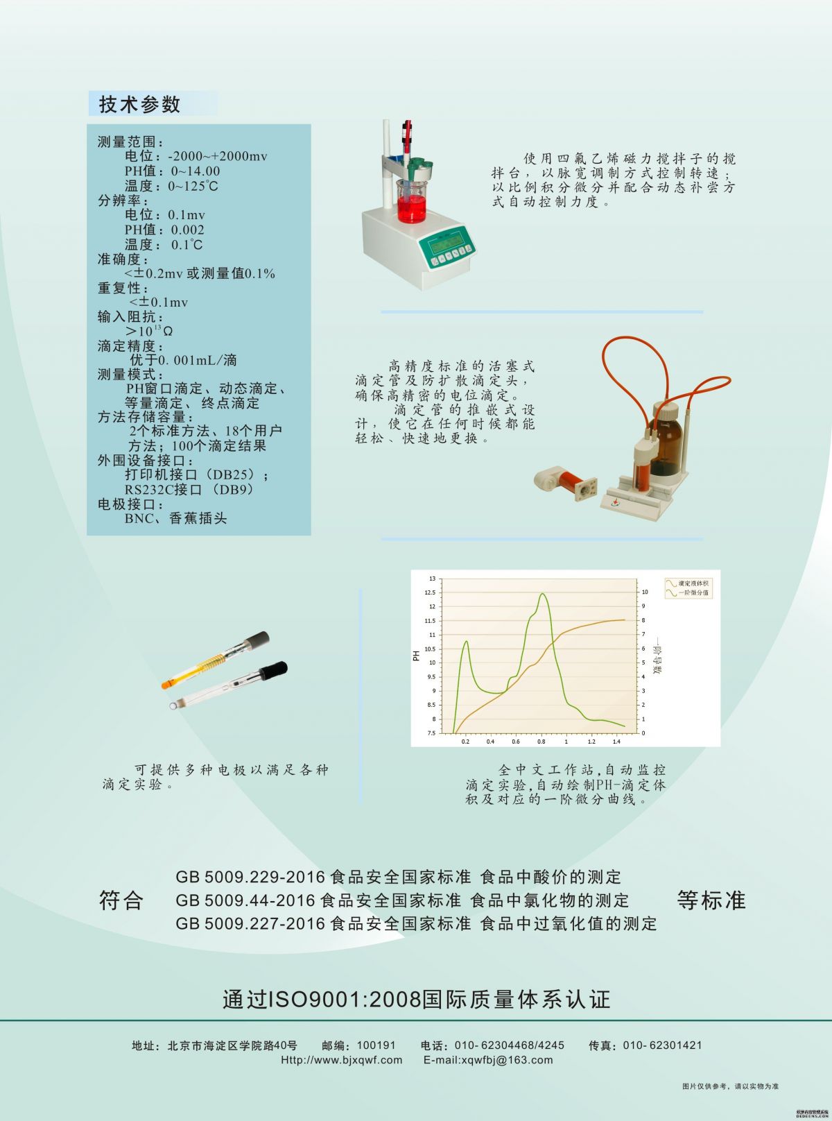 用途:ZDJ-3F是一款专门用于食品检测的电位滴定仪,可以按照国家标准要求进行《食品中酸价的测定》GB5009.229-2016 ,《食品中过氧化值的测定》GB5009.227-2016 ,《食品中氯化物的测定》GB5009.44-2016,《食品中挥发性盐基氮的测定》GB5009.228-2016等十余类食品级质量检测实验,同时还可以搭配不同种类的电极进行非水滴定、沉淀滴定、酸碱滴定、氧化还原滴定等常规的电位滴定实验、/span> 技术参数: 测量范围9/span>电位? ~?,000.0 mv pH值:0 ?4.00 温度? 125 ℂ/span> 分辨率:电位 0.1 mv pH值: 0.002 温度 0.1 ℂ/span> 准确度:<±0.2mv 或测量?.1% 重复性:<±0.1mv 输入阻抗9/span>>1013Ω 滴定精度9/span>优于 0.001mL/滳/span> 测量模式9/span>pH窗口滴定,动态滴定,等量滴定,终点滴定、/span> 方法储存容量9/span>2个标准方法,18个用户方法,100个滴定结枛/span> 外围设备接口9/span>打印机接?DB25)?/span>RS232C接口(DB9) 电极接口9/span>BNC,香蕉插夳/span>