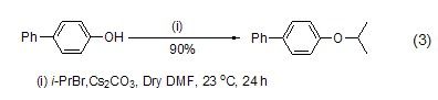 碳酸铯在实现苯酚化合物的O-烷基化反应方面也有非常重要的用途。实验猜测碳酸铯诱导的非水溶剂中苯酚O-烷基化反应很可能经历了酚氧基阴离子,因而对于高活性的、极易发生消除反应的二级卤代物也同样能够发生烷基化反 (?)、/p>
