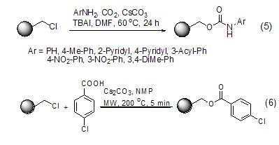此外,由于碳酸铯在有机溶剂中良好的溶解性,使得它在固体支持的有机反应中也具有重要的用途。如在二氧化碳气氛中诱导苯胺与固体支持的卤代物的三组分反应,高产率地合成羧酸酯或氨基甲酸酯化合物 (?)。在微波辐射下,碳酸铯作为碱也能实现苯甲酸与固体支持卤代物的酯化反应 (?)、/p>