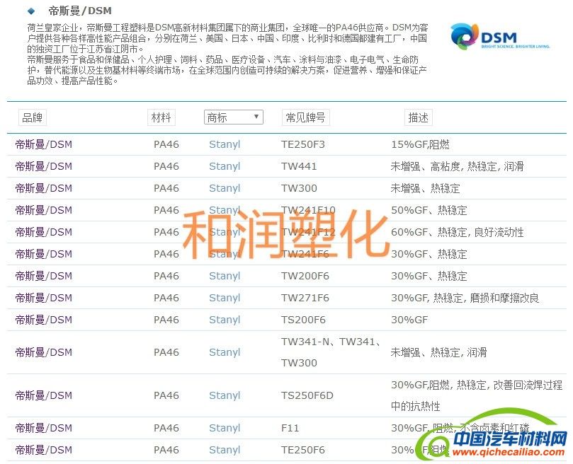PA46特性: PA46(聚己二酰丁二?是一种具有高熔点和高结晶度的新型聚酰胺树脂 PA46熔点高(295℃),热变形温度也高,而长期使用温?CUT 5000hours)可达163℃ 这些特性使Stanyl PA46比其它工程塑料如PA6、PA66、PPA和聚酯在耐热、高温下的机械强度 耐磨等方面具有技术优势,并且成型周期短,加工更经济 优点 1:具有易加工性和卓越的流动性能 2:具有卓越的抗拉强度、良好的绝热性能 3:阻燃、可电镀、经热稳处理的、耐热的 4:高刚度保持性能,同时表现出良好的高温抗蠕变性 电气及电子应用: SMD元件,接插件,断路器,绕线元件,电动马达部件和电器元件; 机载部件应用:齿轮、轴承和轴承罩汽车应用:传感器和连接?/p> |