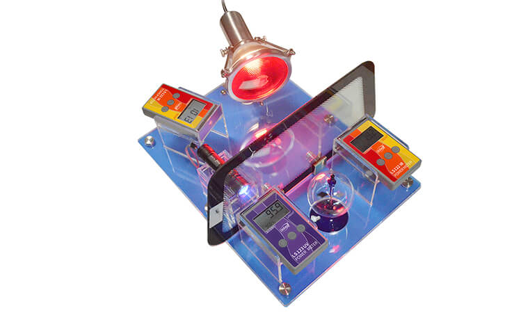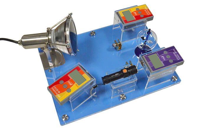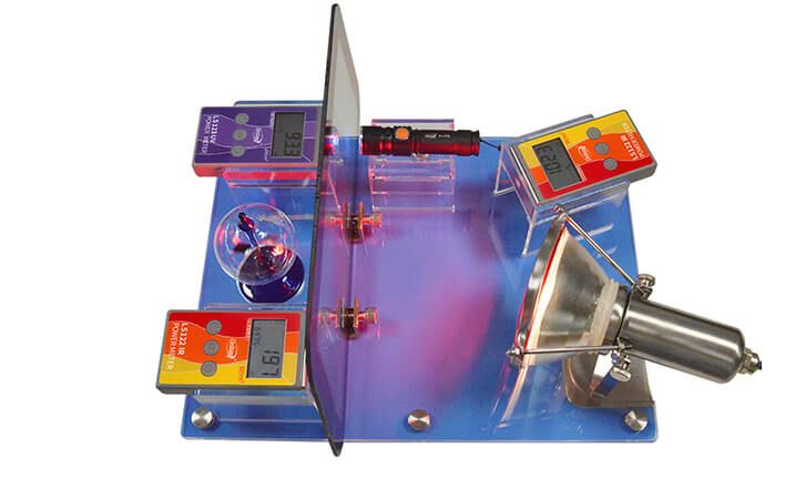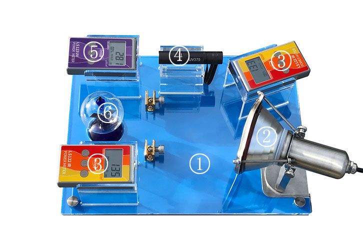 FS2150太阳膜反射测试仪用于展示太阳膜、隔热玻璃等材料对光线的反射及阻隔效果。红外线灯对面的LS122红外功率计用于测试太阳膜,隔热玻璃等的红外线阻隔率,即隔热效果;同侧的LS122红外功率计用于测试太阳膜,隔热玻璃等的光反射能力大小;LS123紫外功率计测试太阳膜,隔热玻璃等的隔紫外能力。光强魔镜用于生动演示隔热效果,光强魔镜的叶片旋转速度和光线的强度成正比