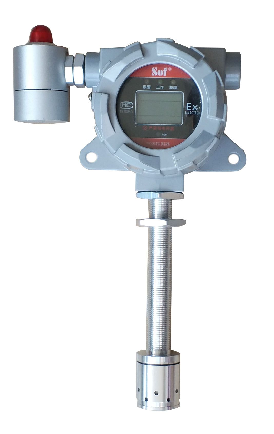 气体报警装置为防爆型仪表,其组成为两个部分:探测器与报警控制器,探测?一次表)安装在可能有气体泄漏的危险场所,其核心元件为气敏传感器;报警控制器(二次?安装在安全场所的值班室内、/span> 当空气中有可烯气体或可燃有毒性气体挥发的蒸汽时,探测器检测信号通过电缆立即传送到报警控制单元,控制器显示出气体浓度,当超过设定的报警浓度值时,报警控制器即发出声、光报警信号并输出联动控制信号,控制风机等设备排除险况,从而起到保障工厂安全生产,避免事故发生。广泛用各类炼油厂、油库、化工厂、液化气站等易发生可燃气体泄漏的场所、/span> 执行标准9/strong> 索富通气体报警控制器SST-9801B-EX执行标准9/span> GB 16808-2008 《可燃气体报警控制器系统规程《/span> 索富通可燃气体探测器SST-9801TB-EX执行标准 GB15322.1?003《可燃气体探测器?部分:测量范围为0?00%LEL的点型可燃气体探测器《/span> GB 3836.1-2010 《爆炸性环 ?部分:设 通用要求《/span> GB 3836.2-2010 《爆炸性环 ?部分:由隔爆外壳“d”保护的设备《/span> 产品特点9/strong> 技术参数: 检测气体:可燃气体 检测原理:催化燃烧式、/span> 浓度单位?-100%LEL、/span> 输入信号:RS485 显示方式:数?模拟显示 报警设定:一段报警输?%?5%LEL(默认20%LEL),二段报警输?0%LEL 报警方式:声、光报警 报警输出:二段报警输?触点容量5A/250VAC) 信号输出:标准电?-20mA输出/RS-485接口MODBUS通讯协议(选型) 温度范围?10%?250ℂ/span> 相对温度?0%?5%RH(非凝? 电源:AC220V/50Hz 最大功耗:?.5W/?/span> 最大传输距离:1200M 总线构图9/strong> 探测器型号及外观尺寸9/strong>