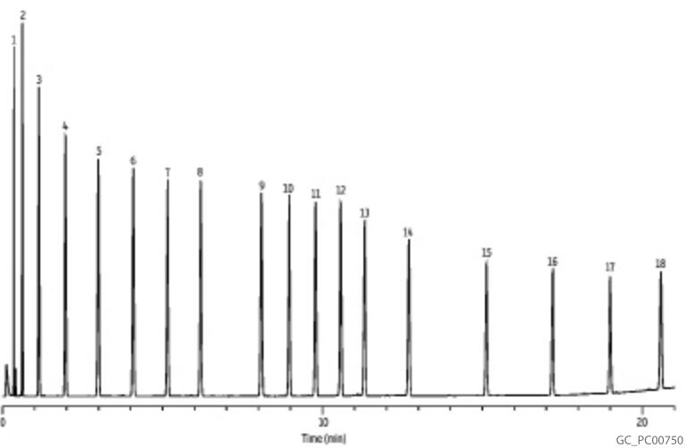 Rtx?-2887 色谱 (熔融石英) (非极?专利Crossbond?技术键?00%二甲基聚硅氧烷—用于模拟蒸? ? 模拟蒸馏专用柱、/p> ? 温度稳定?60 °C、/p> Rtx?-2887色谱柱的固定相、尺寸和膜厚在设计时即针对ASTM方法最新版本所要求的分辨率和不对称因子而加以最佳化处理。每个柱子都经过单独试验以保证稳定的基线、低流失和保留时间重复性良好。专利Crossbond?技术键合甲基硅氧烷固定相与填充柱相比稳定性增加、基线更加稳定、老化时间也减少了、/p> ID df 温度 10籲/p> 0.53 mm 2.65 μm -60 to 360 °C 10199 类似固定盷/strong> DB-2887, Petrocol 2887, Petrocol EX2887 Rtx?-2887分析蒸馏产品(C5-C44) 色谱 Rtx?-2887, 10 m, 0.53 mm ID, 2.65 μm (货号10199) 样品 C5 C44烃类标准?/p> 稀释剂: 二硫化碳 浓度: 0.01-0.1 wt. % 进样 进样体积: 1 μL 直接进样 进样口温? 360 °C 柱温箰/p> 柱温 35 °C?5 °C/min升至 360 °C (维持5 min) 载气 He, 恒流 流逞 15 mL/min 线速度: 112 cm/sec ?/p> 1. C5 2. C6 3. C7 4. C8 5. C9 6. C10 7. C11 8. C12 9. C14 10. C16 11. C18 12. C20 13. C24 14. C28 15. C32 16. C36 17. C40 18. C44