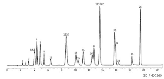 Rtx?-5 色谱 (熔融石英) (低极性固定相; Crossbond?技术键合二苯基二甲基聚硅氧? ?药物,溶剂杂质,农药,烃类,PCB同系物(如氯化三联苯混合物),精油,半挥发性物质的通用柱、/p> ?温度范围?60°C?50°C、/p> ?相当于USP G27和G36的固定相、/p> 二苯基二甲基聚硅氧烷固定相是最流行的气相色谱固定相,并用于多种应用。所有残留的催化剂和低分子量的碎片被Rtx?-5聚合物除去,提供紧凑的单峰分布和极低的流失、/p> ID df 温度? 15 30 60 105籲/p> 0.25 mm 0.10 μm -60 to 330/350 °C 10205 10208 10211 0.25 μm -60 to 330/350 °C 10220 10223 10226 10229 0.50 μm -60 to 330/350 °C 10235 10238 10241 10244 1.00 μm -60 to 325/340 °C 10250 10253 10256 10259 0.32 mm 0.10 μm -60 to 330/350 °C 10206 10209 10212 0.25 μm -60 to 330/350 °C 10221 10224 10227 0.50 μm -60 to 330/350 °C 10236 10239 10242 1.00 μm -60 to 325/340 °C 10251 10254 10257 10260 1.50 μm -60 to 310/330 °C 10266 10269 10272 10275 3.00 μm -60 to 280/300 °C 10281 10284 10287 10290 0.53 mm 0.10 μm -60 to 320/340 °C 10207 10210 0.25 μm -60 to 320/340 °C 10222 10225 10228 0.50 μm -60 to 320/330 °C 10237 10240 10243 1.00 μm -60 to 320/330 °C 10252 10255 10258 1.50 μm -60 to 310/330 °C 10267 10270 10273 3.00 μm -60 to 270/290 °C 10282 10285 10288 5.00 μm -60 to 270/290 °C 10277 10279 10283 ID df 温度 10 20 40籲/p> 0.18 mm 0.20 μm -60 to 325/340 °C 40201 40202 40203 0.40 μm -60 to 315/330 °C 40210 40211 40212 *最高温度列出的为长度较短的色谱柱,较长的色谱柱可能有不同的最高温度、br/> 类似固定盷/strong> HP-5, DB-5, CP-Sil 8 CB, ZB-5 Rtx?-5 (Rtx?-G27)分析有机挥发性杂?/strong> 色谱 Rtx?-5 w/5m Integra-Guard? 色谱 (Rtx?-G27), 30 m, 0.53 mm ID, 5.00 μm (货号 10279-126) 样品 顶空进样药物处理常用的溶剂。准备等于大?00ppm批量药物。样品在90℃下振荡加热15分钟?毫升顶空进样、/p> 进样 进样体积: 1,000 μL 顶空自动进样 分流(分流 2:1) 进样口温? 220 °C 柱温箰/p> 柱温 35 °C (维持10 min)? °C/min升至100 °C ?5 °C/min升至240 °C (维持5 min) 载气 He, 恒压 线速度: 35 cm/sec @ 35 °C 检测器 FID @ 240 °C 注意 FID灵敏? 1.05 x 10 -11 AFS ?/p> 1.环氧乙烷 2.甲醇 3.乙醇 4.乙醚 5.1,1-二氯乙烯 6.丙酮 7.异丙 8.乙腈 9.二氯甲烷 10.正己烶/p> 11.正丙 12.甲基乙基 13.乙酸乙酯 14.四氢呋喃 15.氯仿 16.1,1,1-三氯乙烷 17.四氯化碳 18. 19.1,2-二氯乙烷 20.正庚烶/p> 21.三氯乙烯 22.正丁 23. 1,4-二氧杂环己烷 24.吡啶 25.甲苯