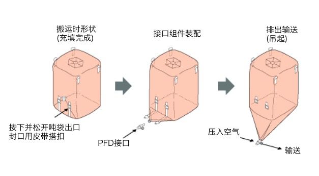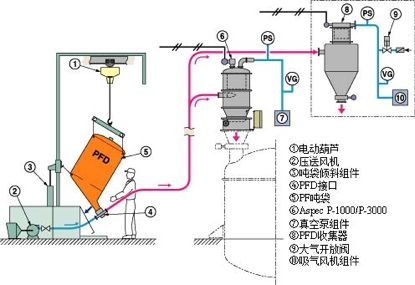 原理9br/>快速连接接口组件! 完全摒弃?K操作?br/> FIBC (吨袋)是粉粒体的搬运手段,作为散装货物的大型化和省力化中的佼佼者,得到越来越广泛的应用。但是,另一方面,接料侧经常发生扬尘的情况导致工作环境恶化、环境污染和异物混入。而且无法避免进入接近1吨的吨袋正下方进行开袋这一危险操作,也就是所谓的3K操作 东洋优质PFD就解决了这些难题。它是唯一能在完全密封的状态下进行空气输送,具有众多优点的装置、br/>特点9br/> 完全无扬尗br/> 最适合碳粉、颜料等有色物料和有害物料、br/> 摆脱了危险操佛br/> 不在有重量的吨袋下操作。避免了作业中吊绳磨损而造成的危险、br/> 节约设备、节约劳劚br/> 只需要连接PFD的接头就可以实现原料的空气输送。能同时实现简化工程和改善操作环境的目的、br/> 防止异物的混?br/> 因为在密闭的状态下操作,不受外部环境的影响而引发异物混入、br/> 能从吨袋中完全排斘br/> PFD运行中类似气球的效果,以及排料结束前吨袋膨胀收缩工序,能使吨袋中原料完全排出、br/> 在完全密闭的状态下运行