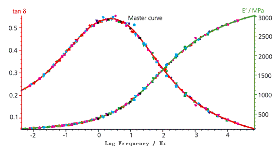 在多频测试的基础上,若使 Williams-Landel-Ferry (WLF)方程以某参考温度(图中 -20°C)为基准进行外推,可得到频率外推曲线(主曲线,又称为TTS曲线),推算常规测试所不能达到的极高与极低频率下的 E’和 tanδ数值、/span>